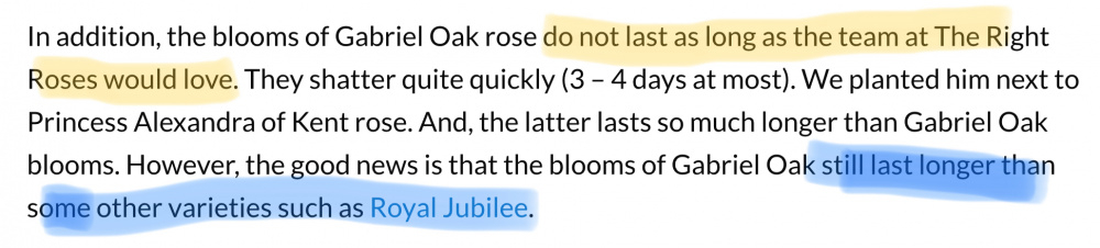 @Mr. Vine Eye .... they make the fatal mistake of reviewing Austins when they've only had the plant for one season... no full review should be given until you've had it 3 years... so their reviews should be taken with caution... and as far as RJ is concerned... total rubbish... ....I've no idea how long Gabriels blooms last,... I used to keep cutting them off and walking around the garden with them... 3-4 days is fine with me... I should think a little longer when the rose is fully grown... lots of rose blooms only last a few days....so we shouldn't let that put us off... where I did agree with them was on the rose 'Imogen'... the blooms do shatter all too quickly for such a pretty rose...
