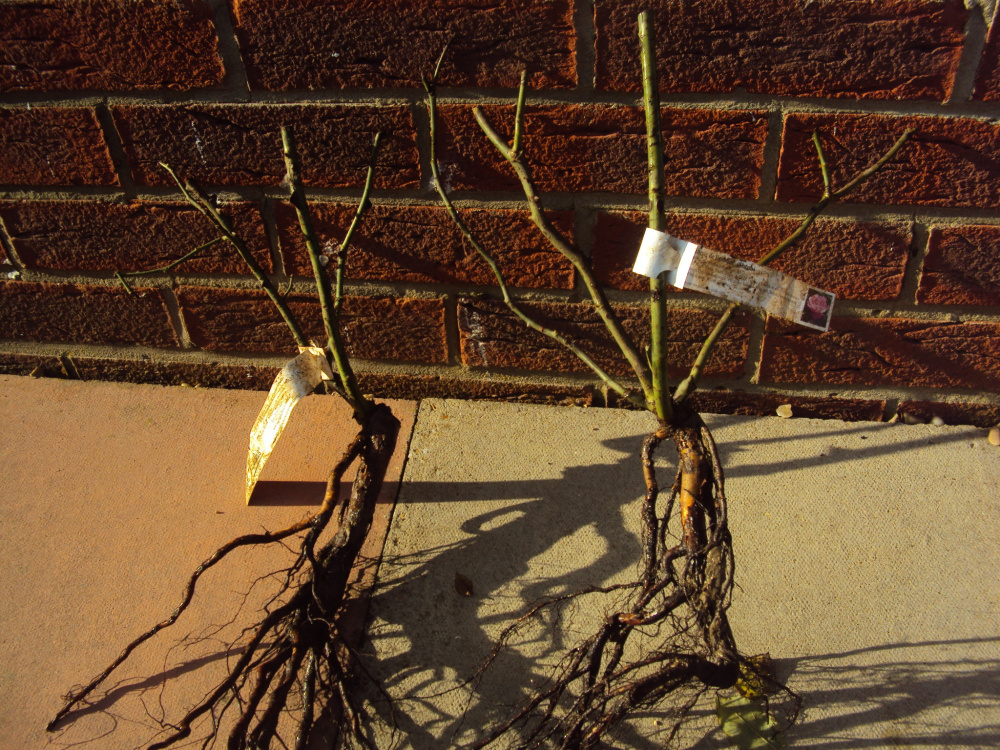 ...these roses came today from Beales roses... they prune them back and trim the roots, so these are the smallest I've had so far... and I would like to have seen an extra cane on the left one, which is a new rose 'Liverpool Hope'.... possibly they don't have enough budwood for extra canes at this stage... but it could be better... the right one is quite good...