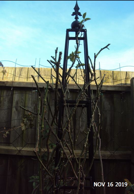 I like to get ahead with my autumn/winter pruning, so I've already started that.. much too early but I do a few each week... this is one obelisk I've just reset for next year... there are 2 roses on it, and I won't do any more to this but check it over next March.. ...these roses are too stiff for twining or fancy twirling...