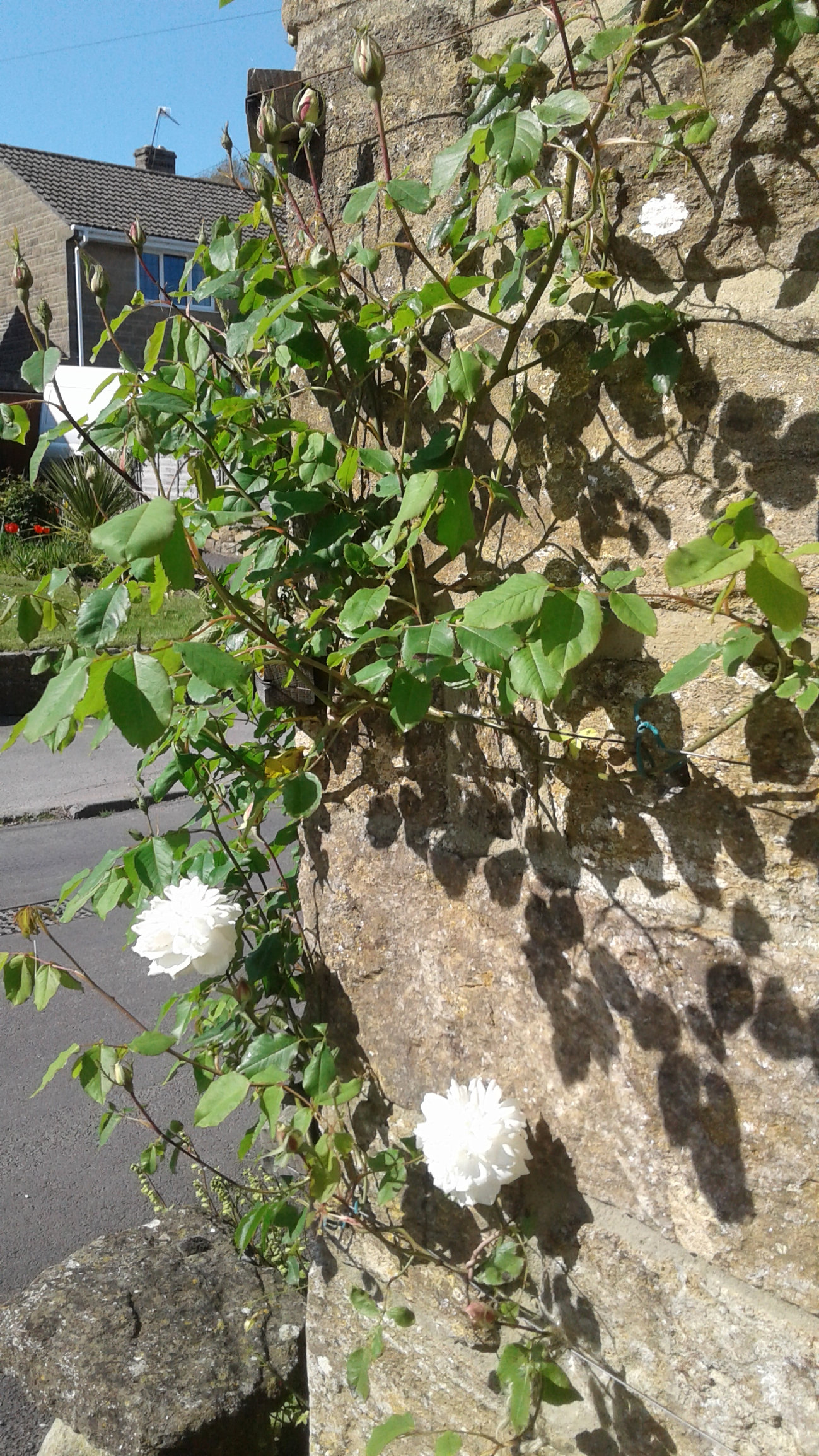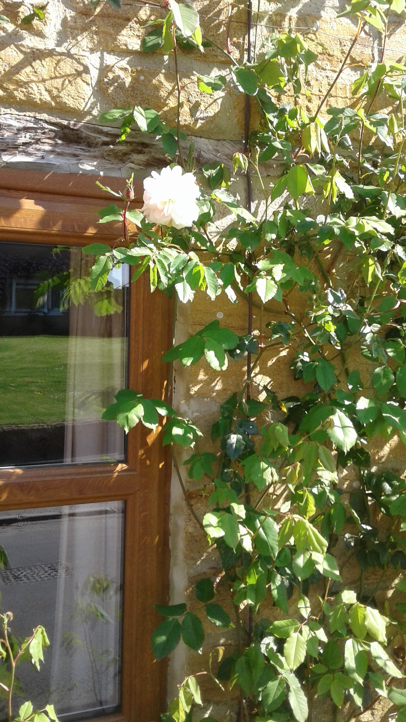 Here is Madame Alfrede Carrierre, flowering beautifully, first bud opened on Wednesday and now she has started flowering round the corner on the shady side. Lots more buds ready to open so I hope the weather doesn't change to drastically.