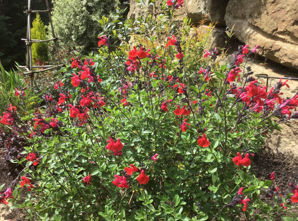 I do get the benefit of earlier than usual flowering perennials though. At the moment, lots of salvias, gaura, nepeta, verbena bonariensis in full bloom plus buds on the echinacea already. The perennials fill in the gaps of the roses ok tho. Heres a rose I missed earlier, Warm Welcome, plus a few salvias, greggii and caradonna respectively: