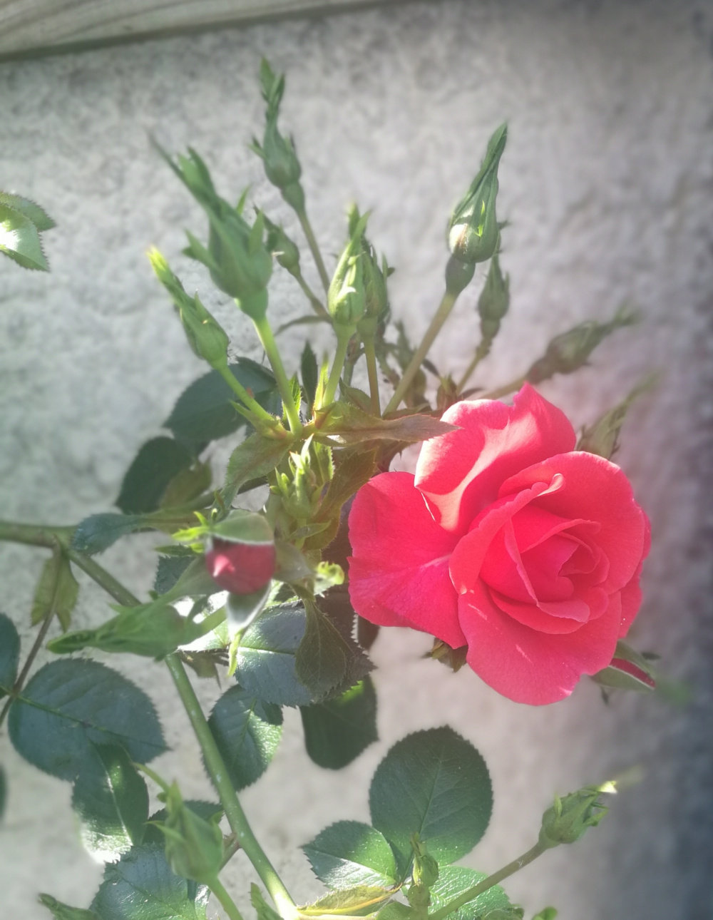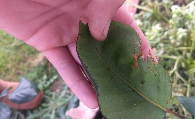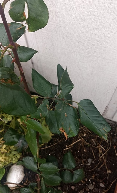 ok I have a couple of problems today, the first one is my son's only rosebush. He is new to gardening and seems to be having a lot of problems lately. First let me say that he lives on the coast of Northern California which gets a lot of rain and fog, which contributes I think to some of his problems. here is a picture of his tea rose (It's a red one, but I don't know the name) There is some browning on the edge of a few leaves and it looks to me like the leaves might be curling a little. Any ideas on what it's problem is and how to fix it?