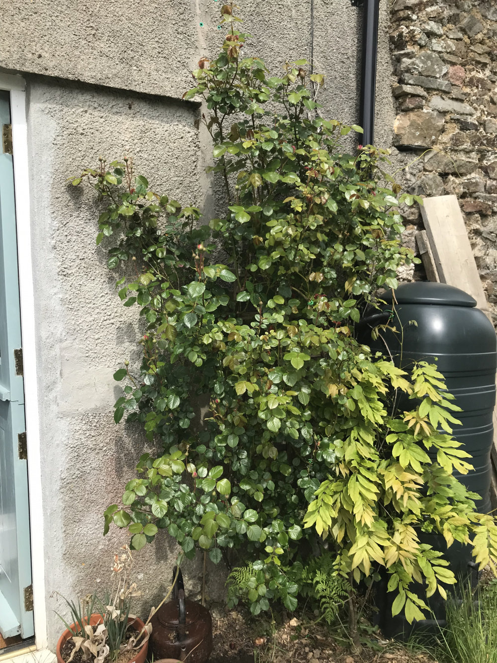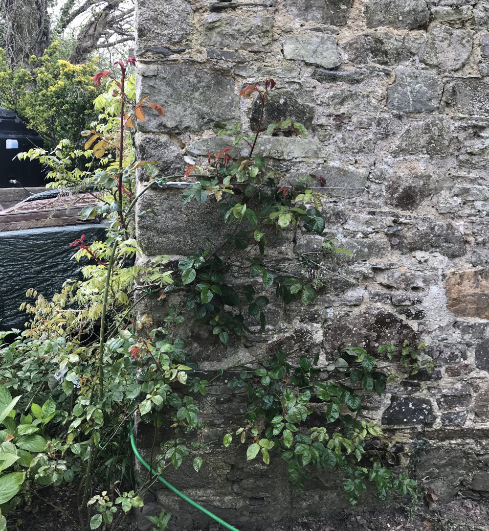 Generous Gardener (Austin) planted 2 years ago on a north east wall. Always late to bloom I guess due to direction it faces? Would like some advice if the way I have trained it looks ok? Please ignore the hosepipe!