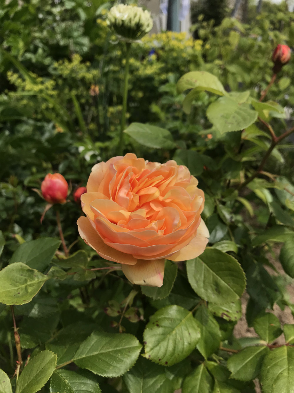 My first rose of the season! David Austin Roald Dahl planted last year, so far seems to have avoided blackspot. Smells divine but now I think I need to be buying them in groups of 3 for impact?! Starts getting pricey then.