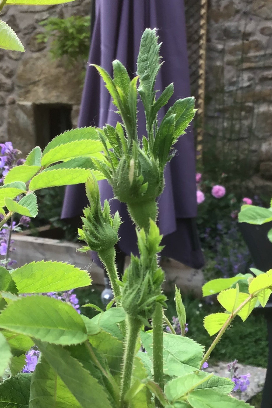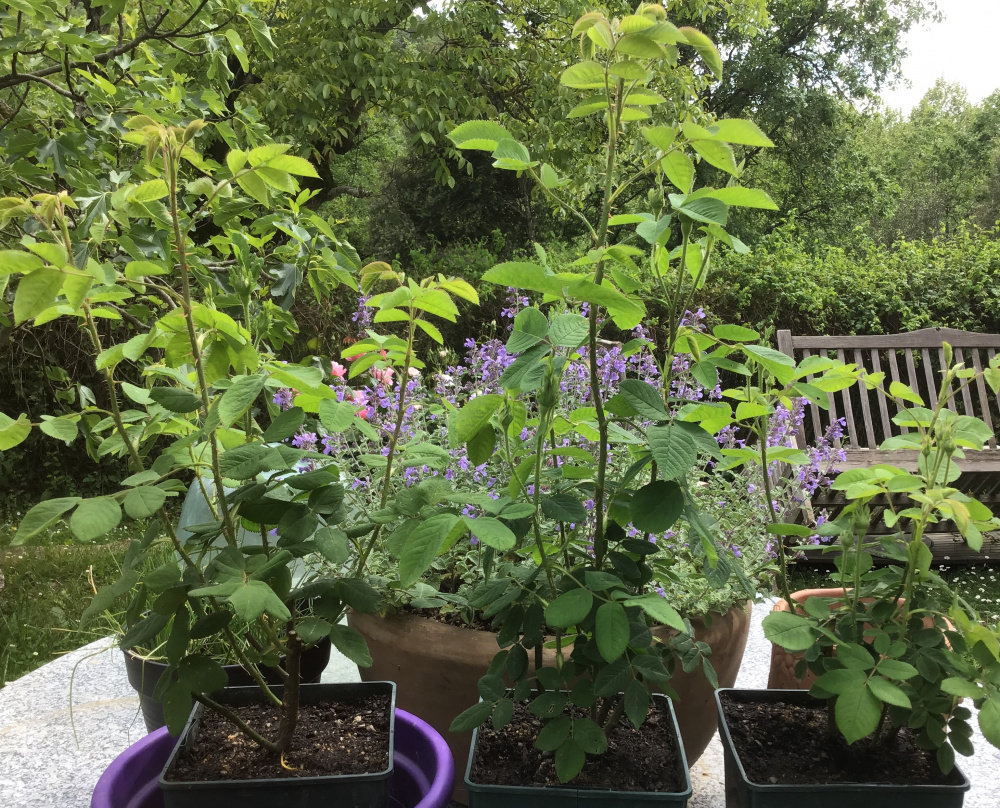 These Mme. Hardy were bare root, received the end of March, root pruned and temporarily potted on into David Austin deep pots. I’m pleased at how far they have come already, looking healthy and have a fair number of buds on, so can’t wait to see them bloom. They also have very jaunty sepals...