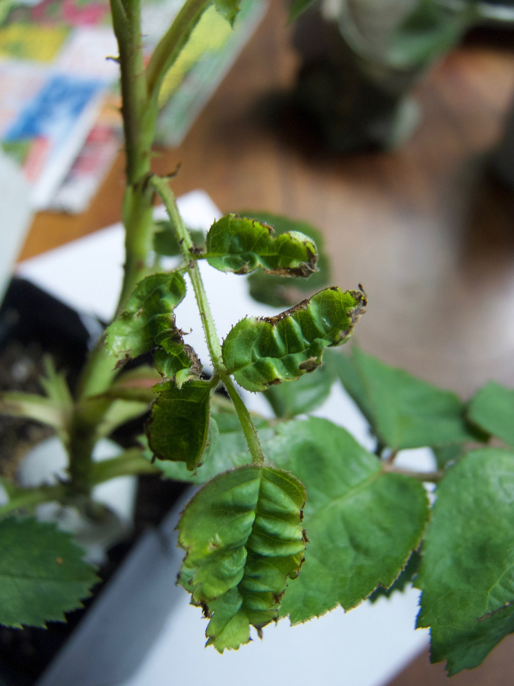 So I received 6 own root roses by mail on Monday. They looked terrible, so I emailed the company with pictures of the paling of the leaves and other not so good looking stuff. I have heard nothing back from them yet. Today they are so much worse. I the first photo is this a deficiency problem or early black spot? The leaves are now starting to fall off. 2 nd. photos, what is causing this deformity?