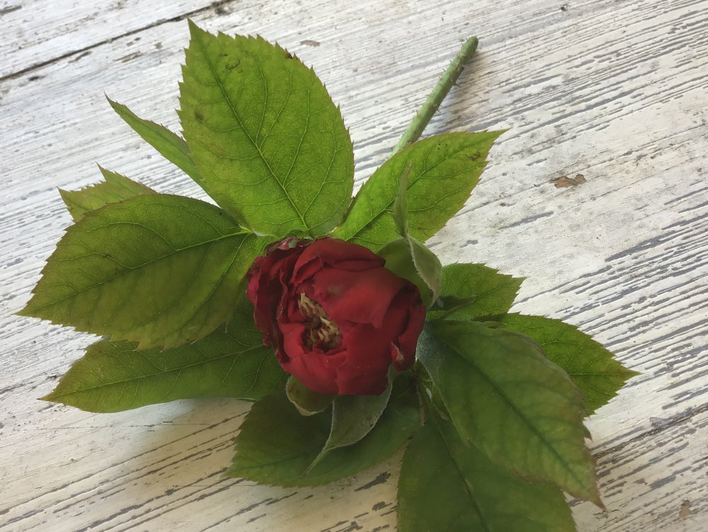 Talking of early season abnormalities, as we were earlier, this bloom of LD Braithwaite is 3cm diameter, instead of the usual 12cm, and is growing directly out of a leaf axil, with no stem:
