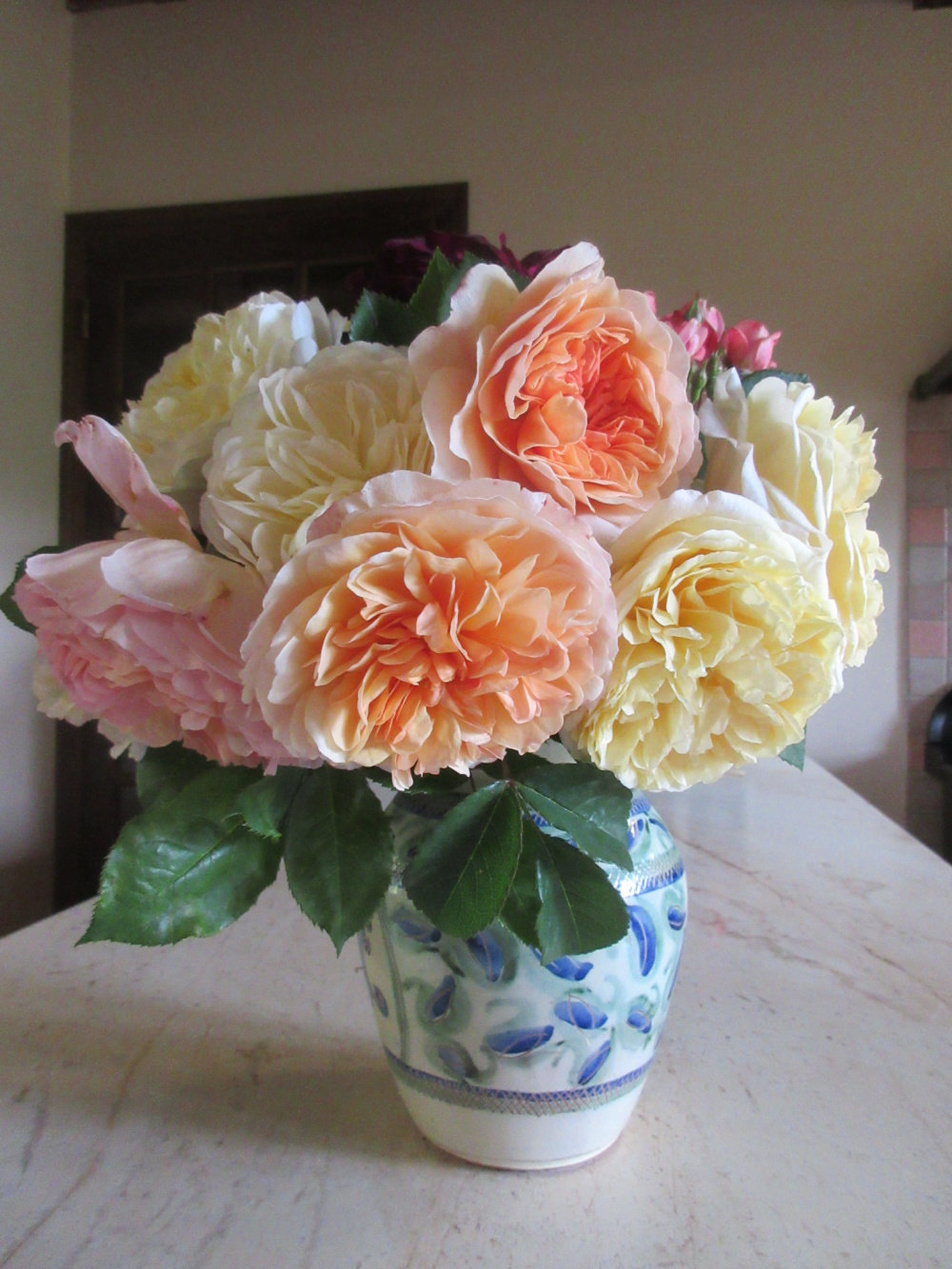 This should have arrived first, vase of roses rom my daughter's garden that she gave me for French Mother's Day on Sunday.