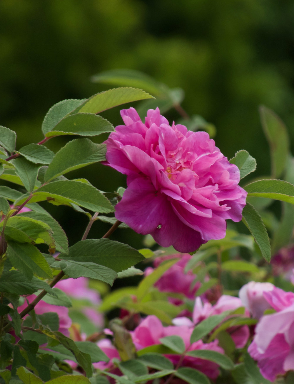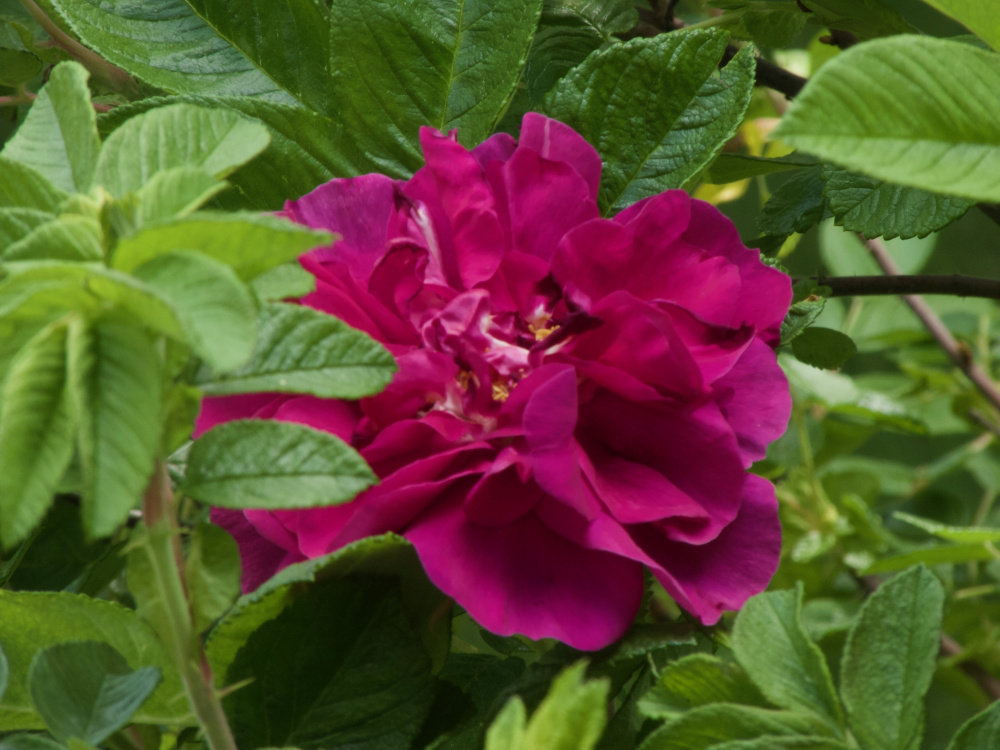 After weeks of nothing but rain, we finally got 2 days of sun mixed in with a few thunderstorms. It was just enough to start the explosion of Therese Bugnet. Remember the diseased leaves I posted a week ago? This is her!