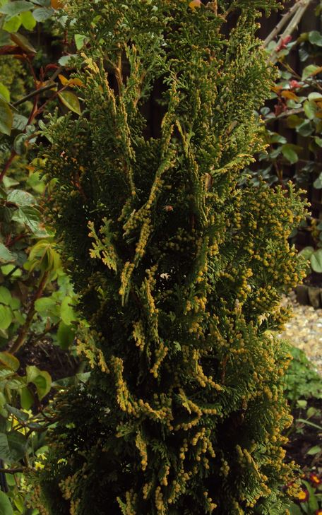A couple for today... I love conifers for small gardens... so I choose slimline upright types.. This is Thuja 'Brobecks Tower' about 5 and half foot tall after 7 or 8 years.. Fits into any narrow border or tight corner... I think they go well in rose gardens..