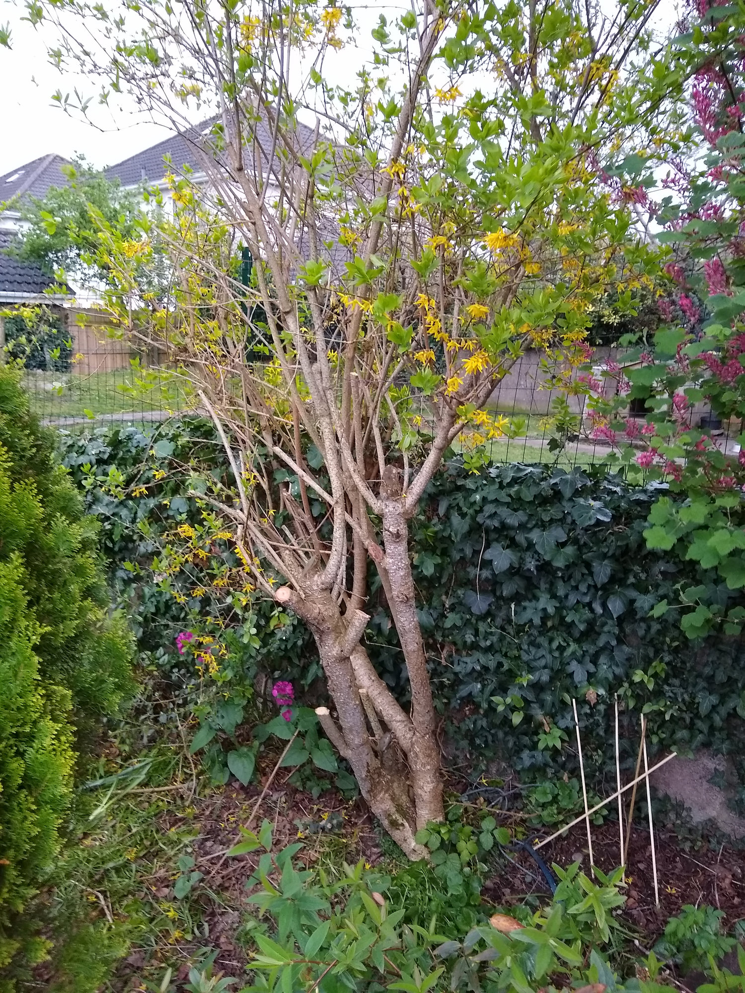Hi all, I am just wondering how to go about pruning these please?. It's a mature forysthia and flowering current. I read that for forysthia I should take some back branches to base. They are quite thick so not sure and worried about doing it. I would ideally like to keep both about 6 foot and for them both to thicken to fill in gaps.