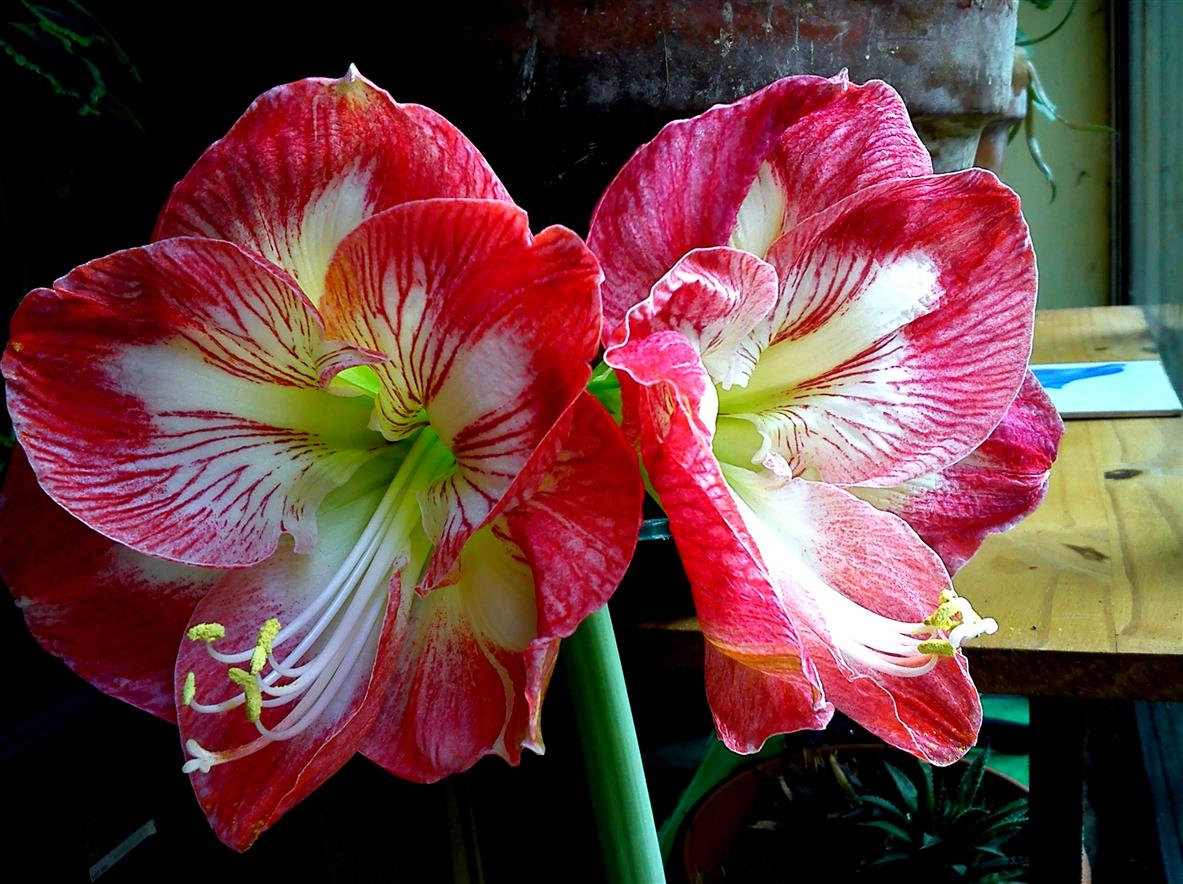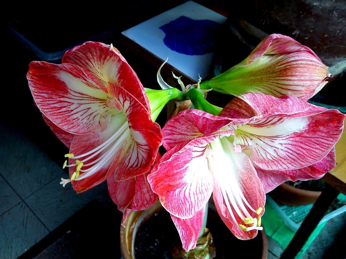 There were four blooms on the Amaryllis 'Minerva',..sadly i knocked against it and broke one off,..i could blame Foxy Molly,..but i couldn't prove it.