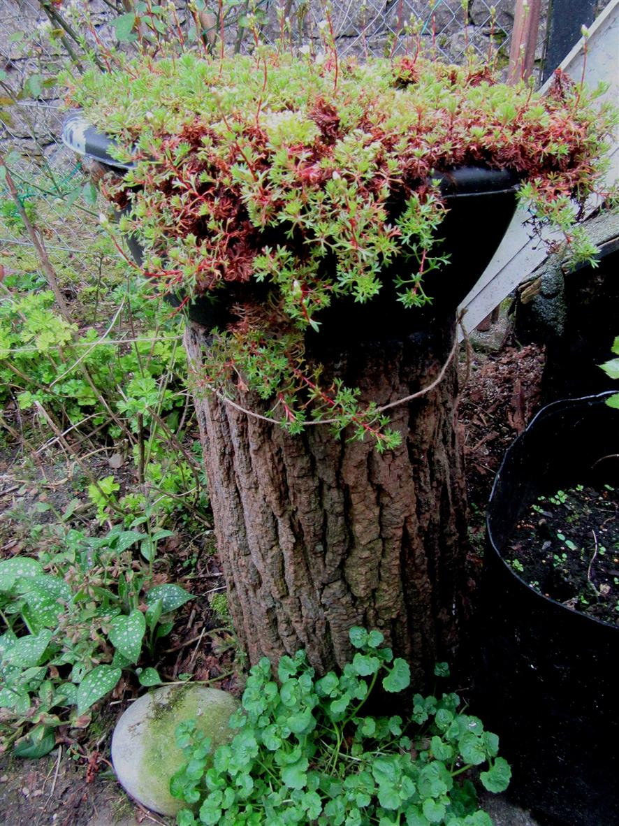 Found a stump of a tree some years back and made use of a basin full of Saxifraga Hypnodies densa,..it produces a mass of white small blooms.