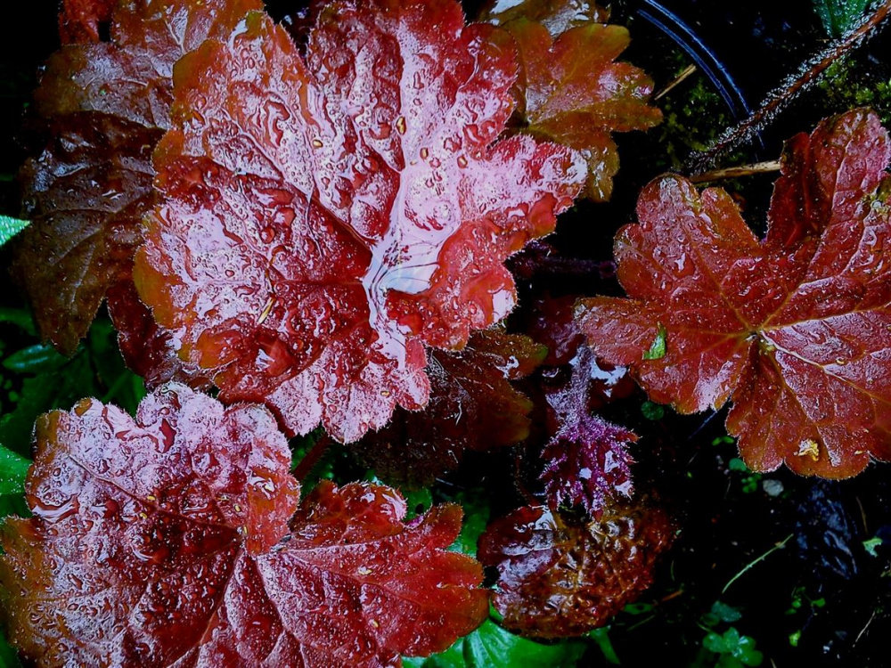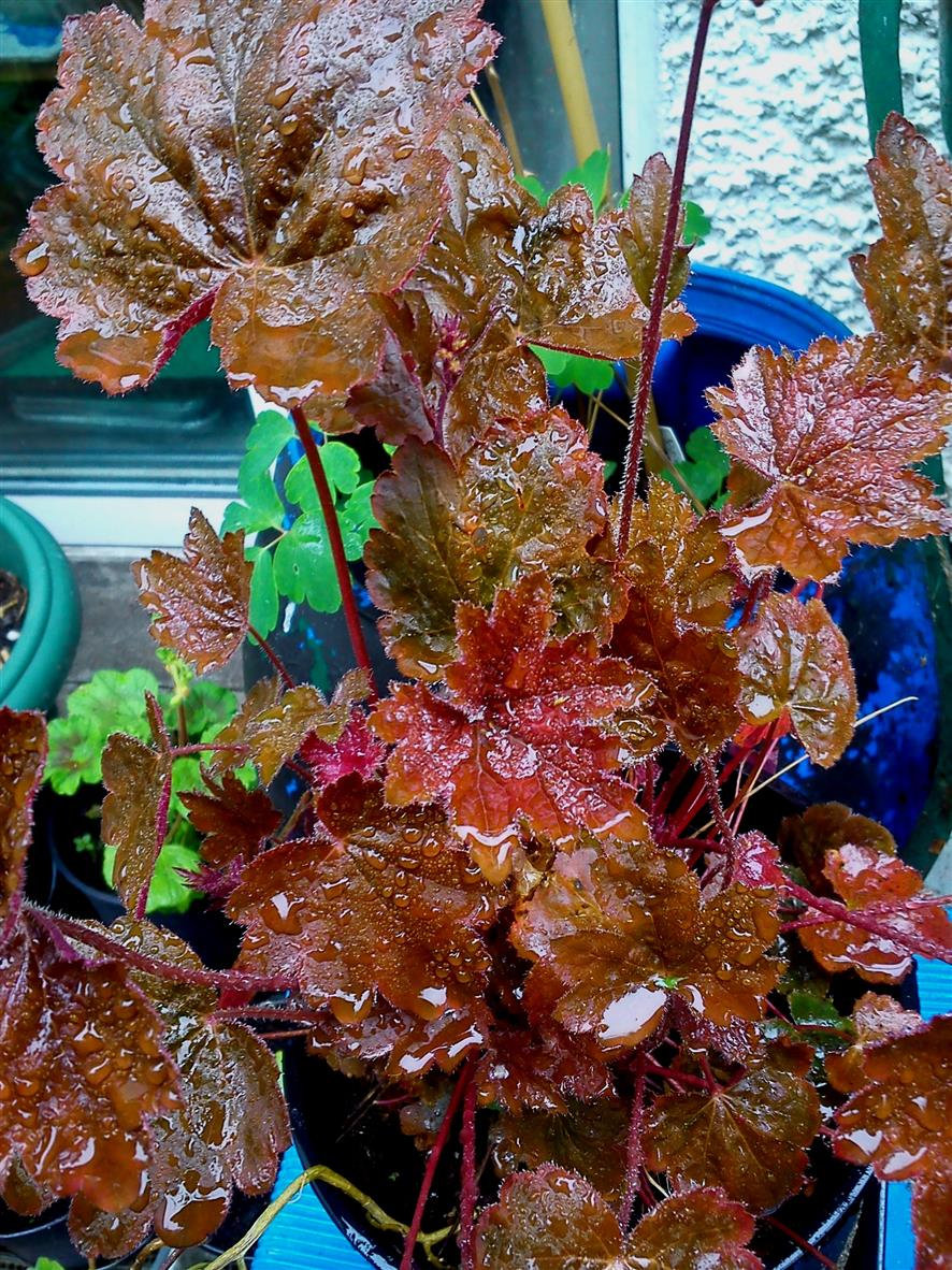 Heuchera 'Melting Fire' and 'Palace Purple',..looking well drenched.