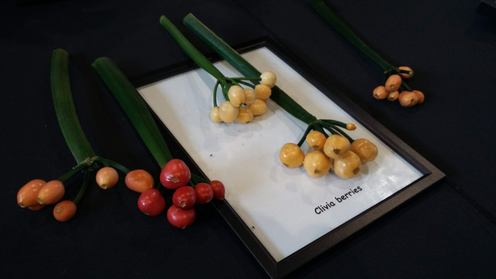 The man showing these, did a lot of breeding for different colours and habits. (He held the National Collection of Clivias.) At the back on the right you can see a couple of variegated leaves; interesting, but maybe the plain green ones set off the flowers better... I'd never seen the seed pods before. He said, to get them to set seed you have to pollinate the flowers by hand with a paint brush, on 3 successive days. The pods are a similar colour to the flowers they come from.