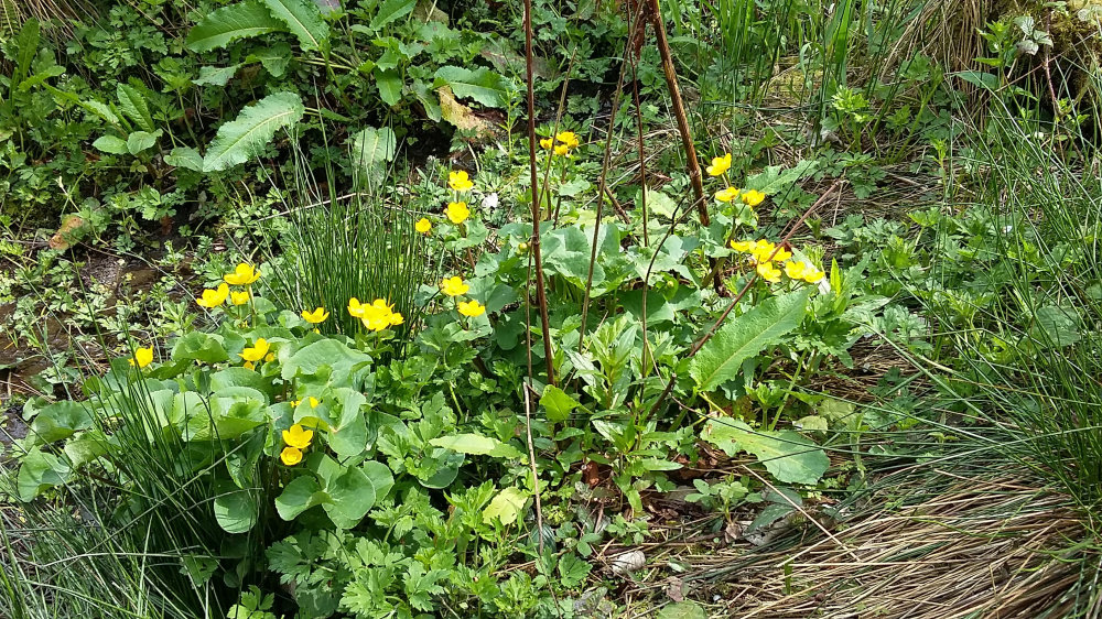 We call it "Marsh Marigold" or "King-cup" - Caltha palustris is its botanical name, I think. It looks very like your Irish "Creeping Jenny". Plants have so many different common names it gets quite confusing... having worked in a garden centre for several years I got used to the local names for some plants, but found there were always some common names which applied to more than one plant. "Black-eyed Susan" was a case in point. There are at least three completely different plants with that common name.