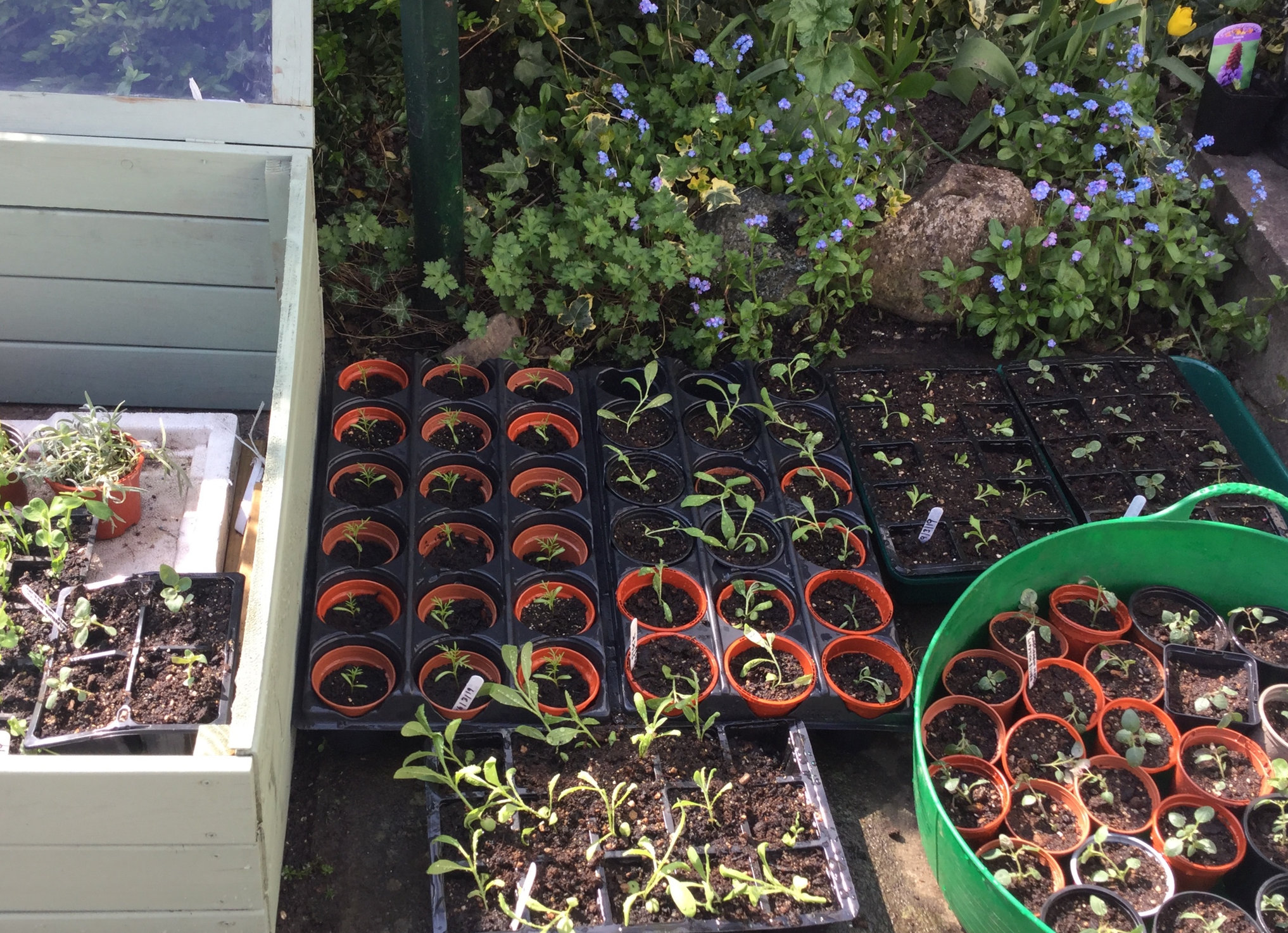 It has been so hot today that it became urgent to get the seedlings out of the plastic greenhouses and potted on. They were wilting as I was doing it, but hopefully they will be ok. I will move the Alderman peas and other stuff out of the cold frame to make room for them. Joy to me is thinking I have run out of 3" pots and then finding a stack of them in the shed!
