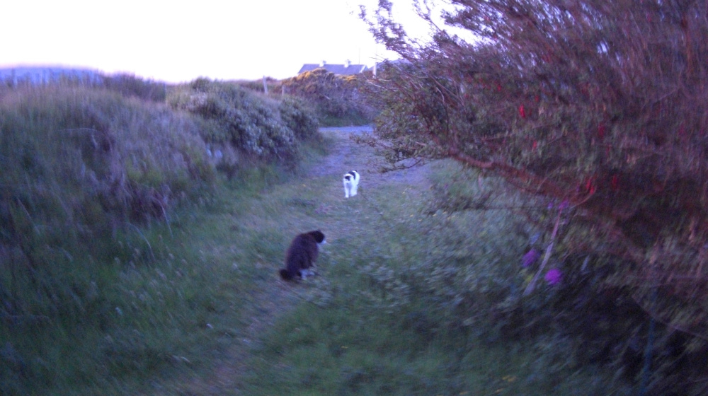 @islander,..nice to see your two cats on patrol,..lovely to know you took in the one that was a terrified street cat,..is that a Fuchsia on the right side of the walk?,..do you do much knitting?,..seeing the wool reminded me of Donegal,..i had a friend there and her Mother plus all the neighbours knitted Aran Type Jumpers.