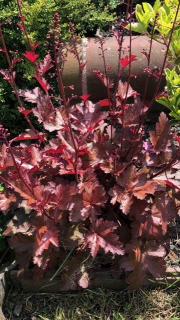 One bit of colour at least. The red soon fades to pink. Another Heuchera not sure of name as label missing. Must confess to having 26!