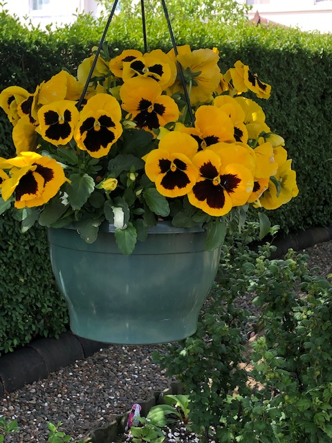 @AnniD Love you hedgehog photo of yesterday and the caption says it all. Did you capture what happened next? You have had an early start but I'm are Mr B. didn't complain. My pair of wood pigeons who come to visit aren't happy as another pair have come to investigate so they spend all their time chasing them off. I also seem to have acquired a pair of "common or garden" pigeons to feed off the ground which I don't mind as long as it remains at two. Don't know how they find out about a food supply. I potted up those pansies in a plastic basket as I don't like the metal ones.