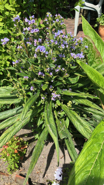 The state of my Echium after it recovered from the sawfly attack. The bees don't seem to mind. You can just see the tiling on the "patio" area.