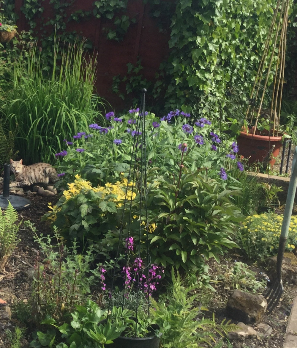 @Purplerain. Bengal looks quite majestic sitting there. Does she have a home nearby? Certainly doesn't look like a stray. Don't suppose your cats like the idea of her making herself at home in their garden. Lovely arrangement of plants you have there. What plant is the tall one with purple flowers? Garden fork at the ready I see. Is your sister a gardener?