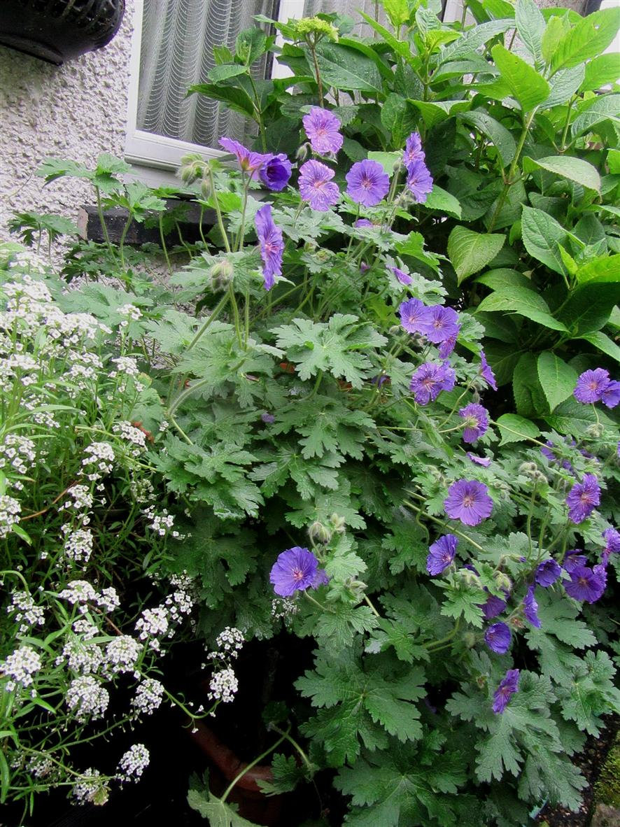 Geranium x magnificum 'Purple Cranesbill',..Sweet Alyssum,..Hydrangea 'Mophead'.