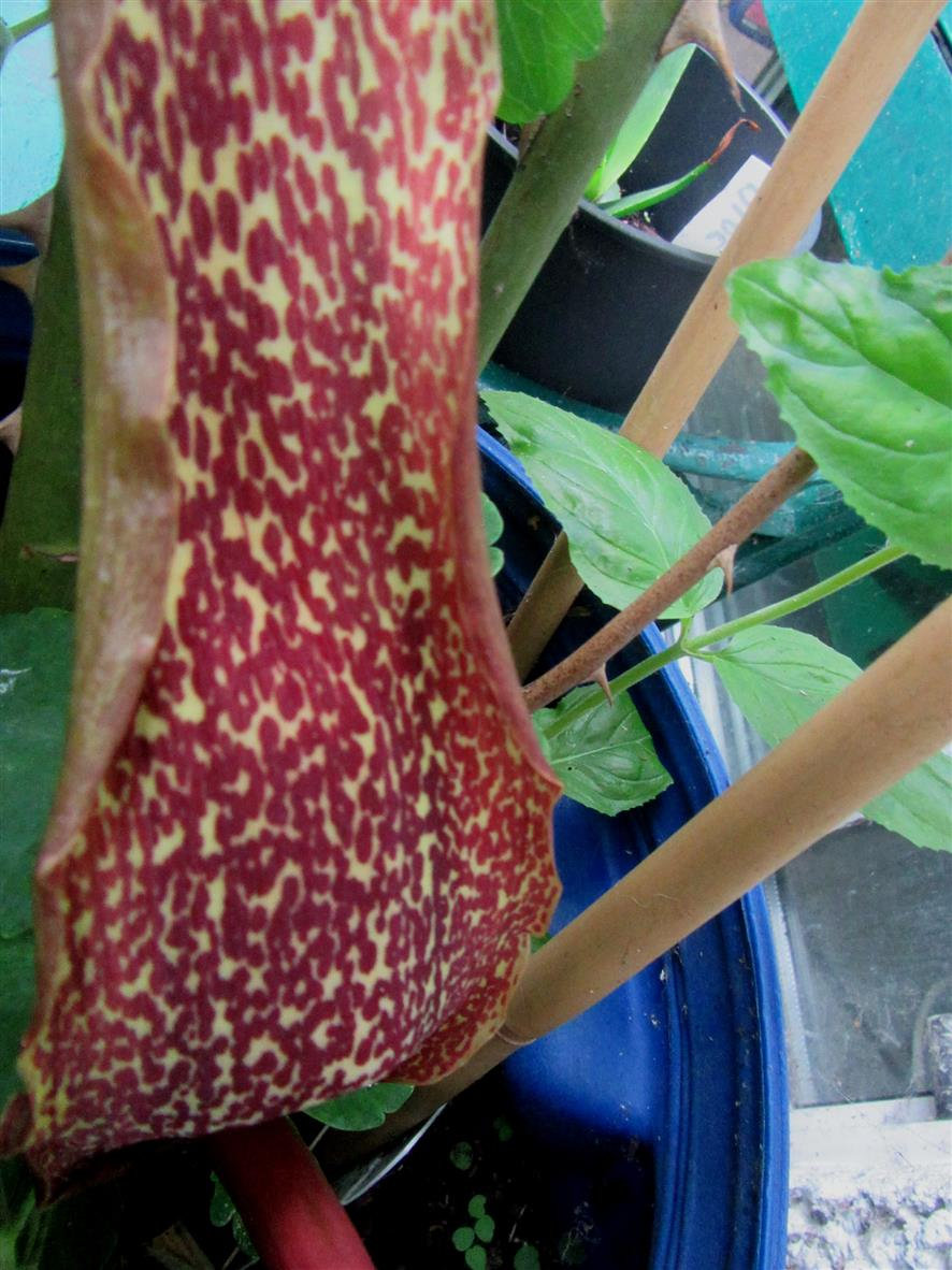 Voodoo Lily,.. bloomed in a container where i have a rose planted,..i didn't notice it because there is an Aquilegia plant growing in there as well.