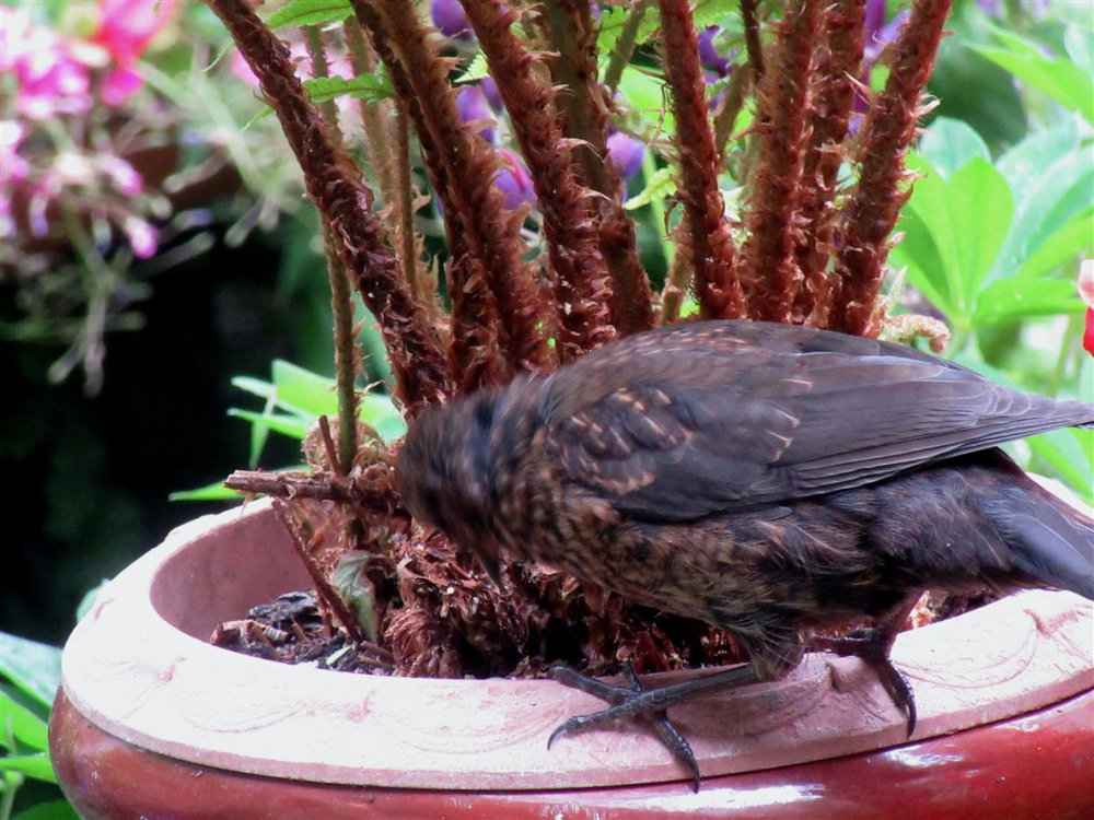 Ah the young Blackbird,..it was only four foot away from where i was standing,..i started placing food for it at the base of one of the Ferns that are housed in the very tall container,..it goes there first every day in fact today i got even closer though i didn't have the camera in my hand.