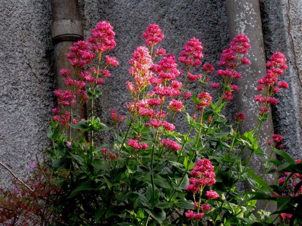 Centranthus ruber 'Red Valerian' also named 'Spur Valerian',..'Kiss Me Quick',..'Devils Beard',..'Jupiters Beard',..growing wild on the wall at the back of the garden.