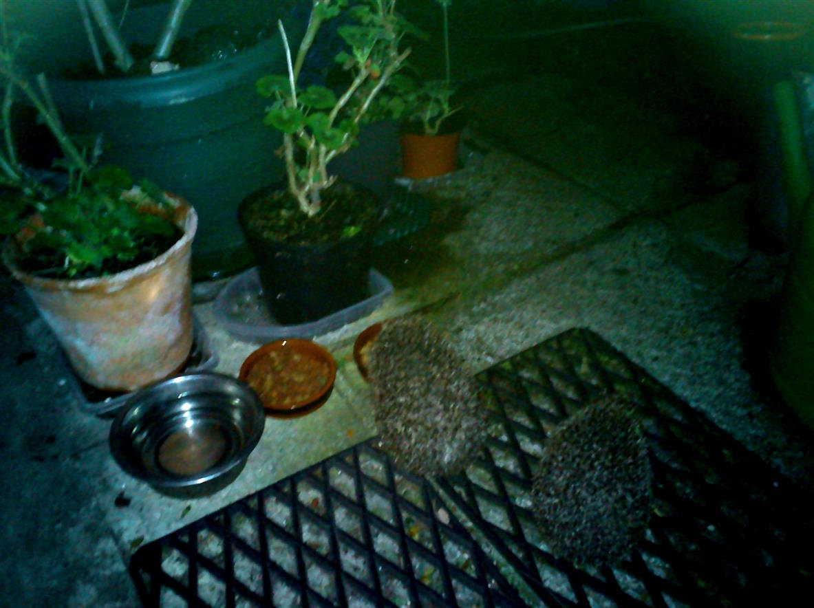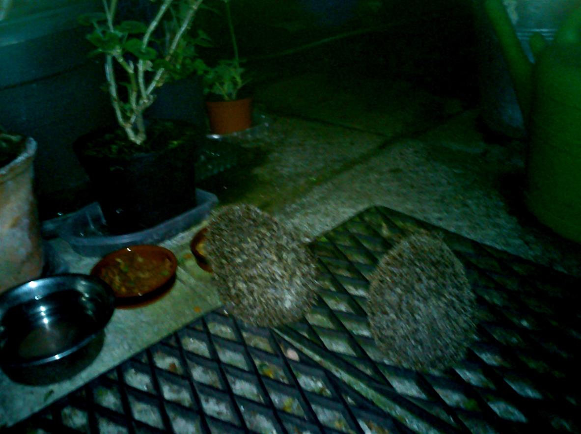 @AnniD,..another scorcher but very enjoyable,..its certainly very warm in your greenhouse,..38C,..hot hot,..it was only 23C=72F in the garden here,..not a human voice to be heard,..Blackbird and Thrush competing as to who can sing the best,..Swans flying over the house and Terns screeching,..the Robin coming closer to me all the time,..Swallows arrived this morning though only a few,..its the same every year just the few in an advance party,..at almost 0230 this morning i opened the back door to let Foxy Molly out before bed time and of course i wasn't prepared for seeing Hedgehogs,..i had to grab the camera very quick as Foxy Molly was in such a rush she jumped over the Hogs,..luckily she didn't scare them off as i managed to capture two images.