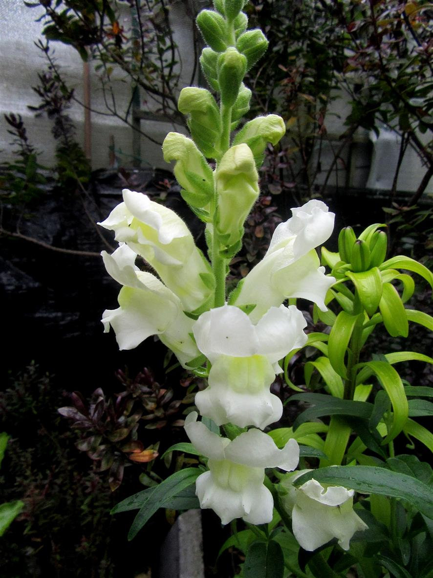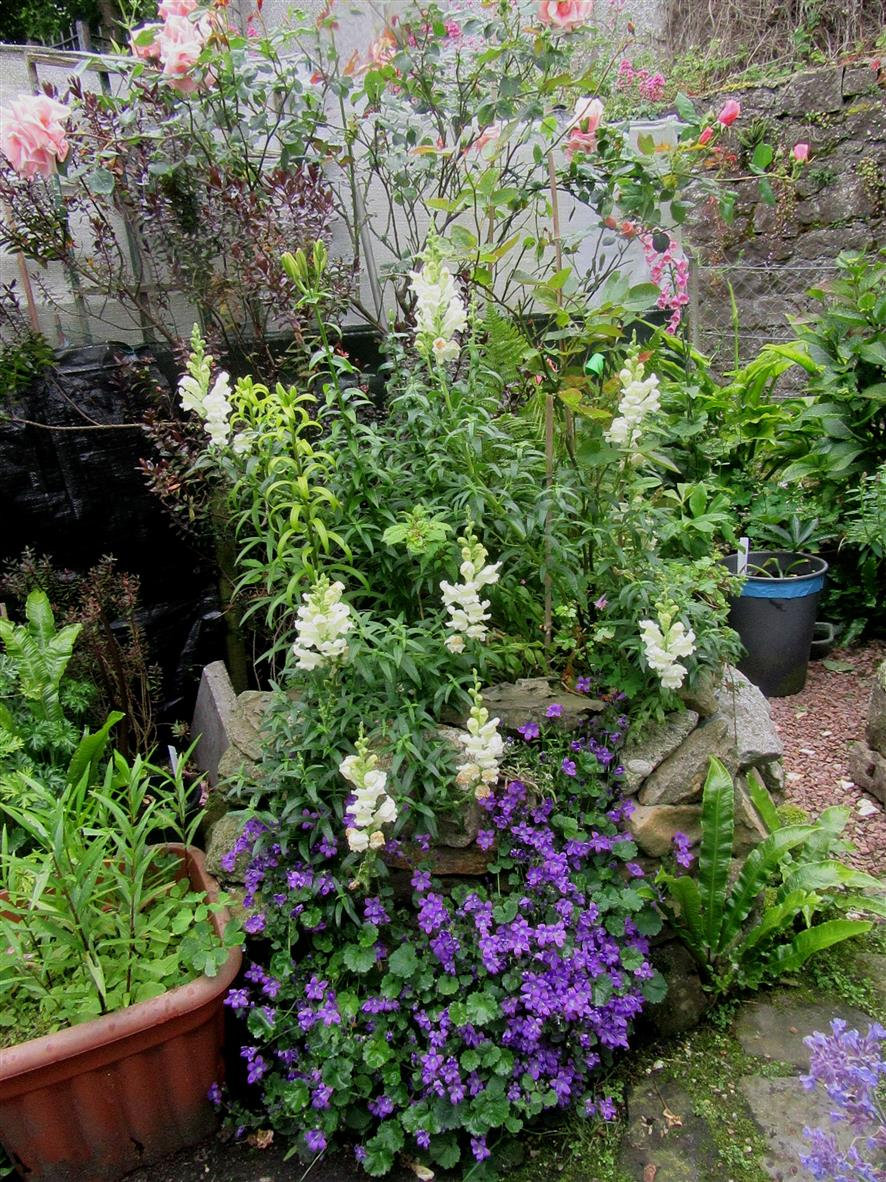 The white flowers are Antirrhinum majus,..growing behind the wall so some will cascade over the side.