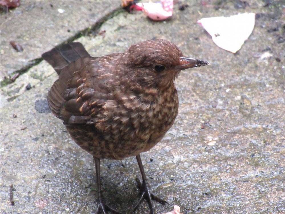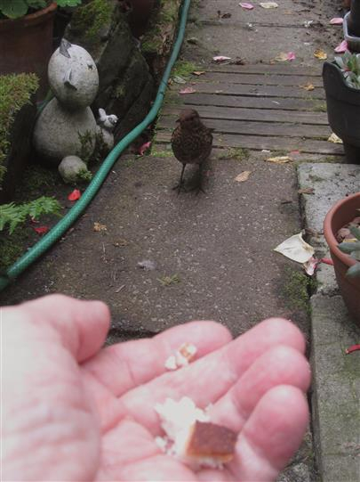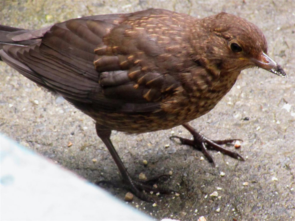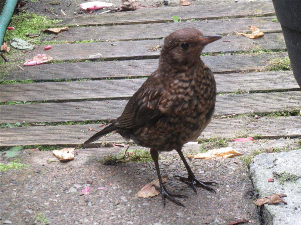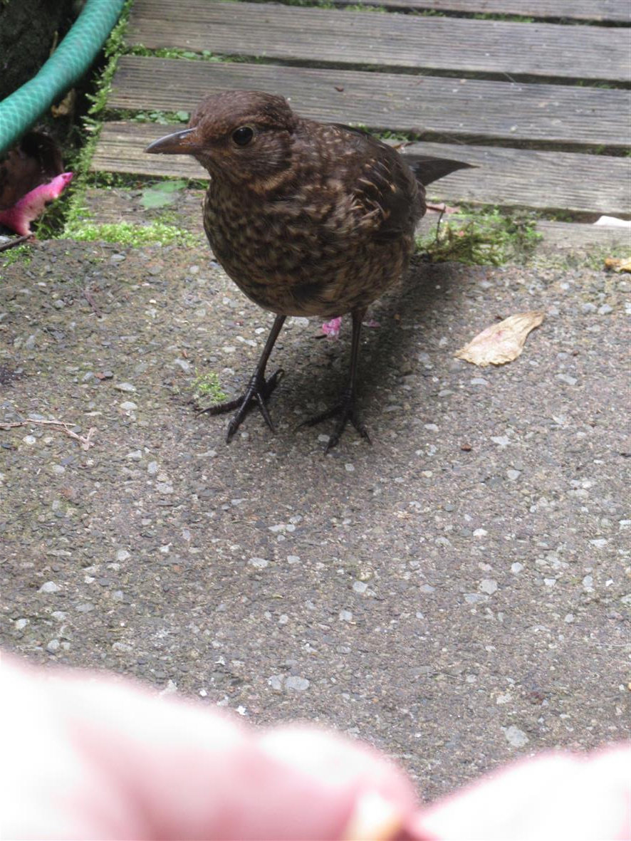 The young Blackbird doesn't arrive for food too early in the mornings,..though getting brave each day.