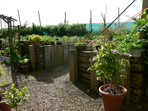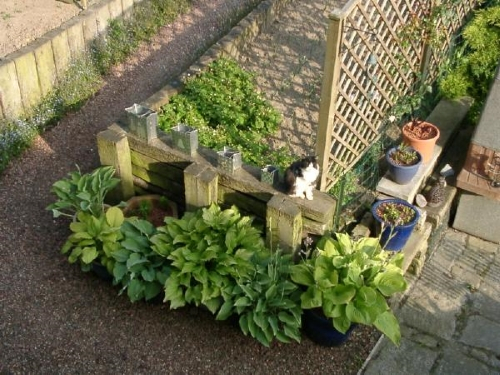 The sleepers were laid on a gravel/broken brick and stone layer for drainage and to level them. The vertical ones that line the path sloping up to the flattened level were trimmed level after "planting. The archway was built to support clematis and thus hide my work/potting area between the house and sleeper wall.