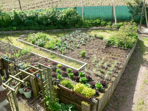 The only exception is one corner which has raised beds for veggies, this is only 3.5m x 2m but was a huge job to level out. I used sleepers for this, only two high and screwed a baton to the back of each and then a stake as it was going into soil and not holding anything back behind it.