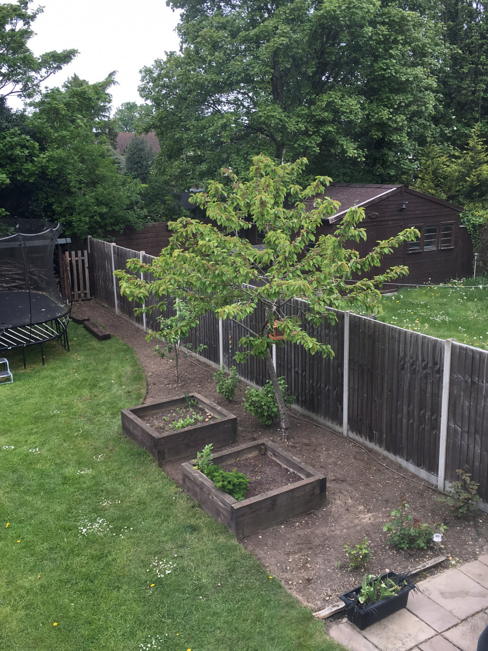 I would like to put some gravel/slates/pebbles or other ground cover in the area that has been dug out (in the picture). Originally I wanted bark but we do get few cats in the area so I gave up on that idea and I am now thinking something stone based. I would love to hear some ideas what might be the best option for us - we have small-ish kids so possibly small gravel isn't best as that would be spread all over the grass; the planters are (will be) used for vegetables so need to walk on it too so not purely decorative.