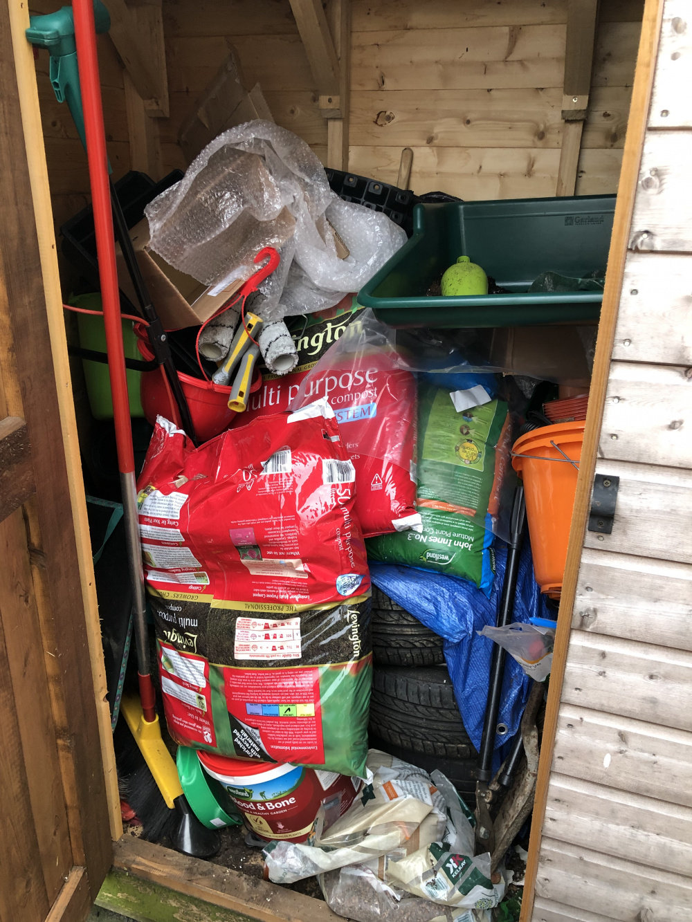 Inside my wee five x three - it’s fun getting the mower out!Â