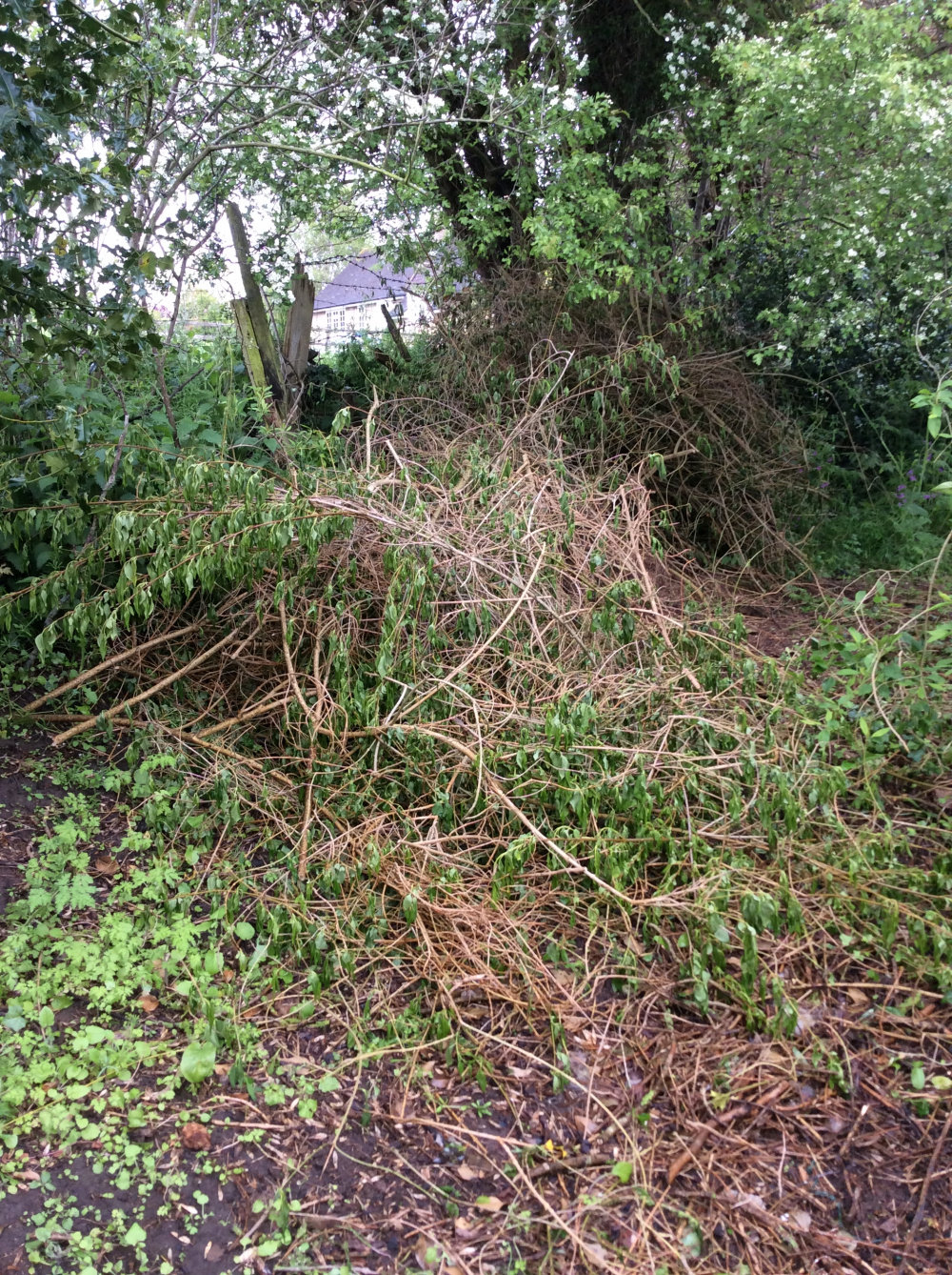 Or there’s this. The gardener has made a pile of forsythia prunings ready to go on the bonfire when the weather is good for nothing else. Look through the clippings and you might see a neat (‘fraid so) stack of roof tiles should we have the inclination to throw out a wing.