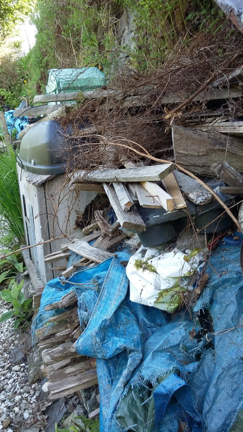 Coal bunker with unusual lid, and gently mouldering wood heap