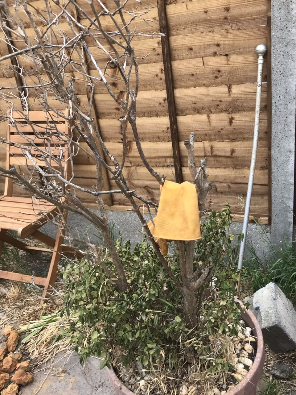 This is a box ‘growing’ in a pot that I inherited in the garden. It fell over one winter and the top bit died. I now use it to dry my marigolds, socks and knickers when I’ve run out of space on the washing line.Â