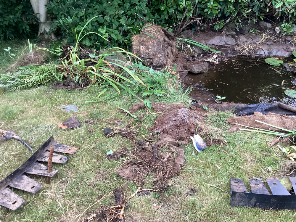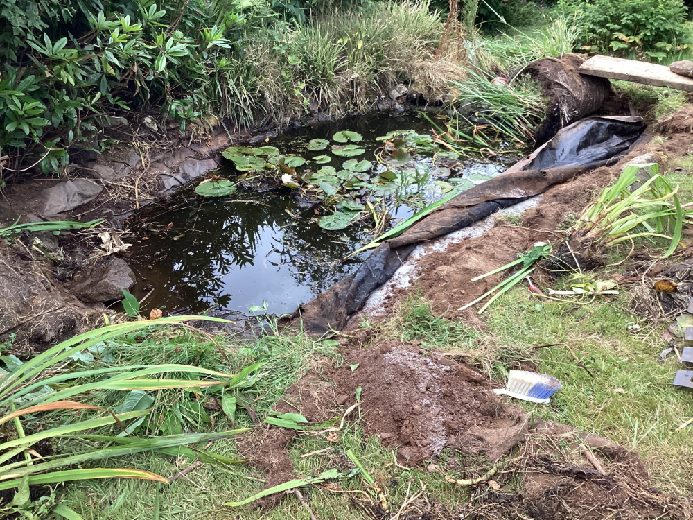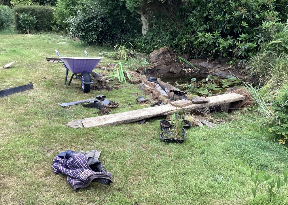 the pond had been reduced to a 4 x 5ā space, and that was covered in lilies and other plants, Ā the sides had completely grown like raised islands, Ā the beach couldnāt be seen at all. itās now restored to its approx 12 x 8ā original size. Ā Weāre going to dig away a bit more off the length so peeled the liner back as you see in the 2nd pictureĀ