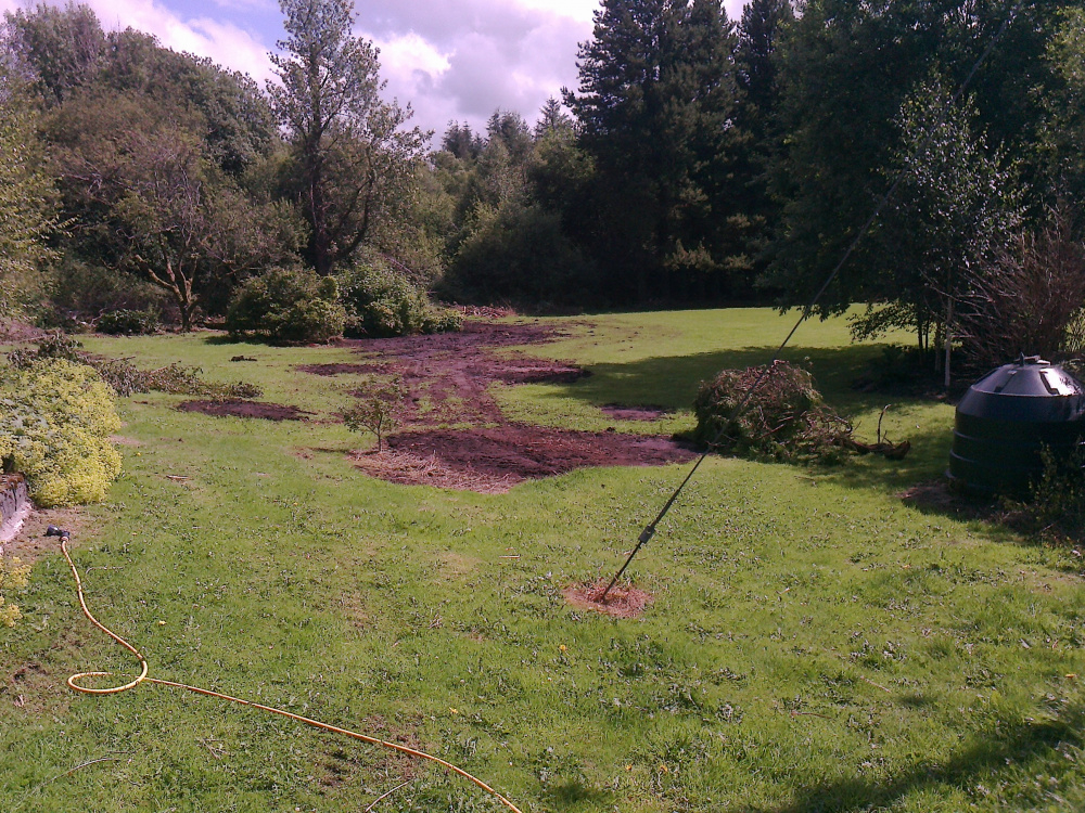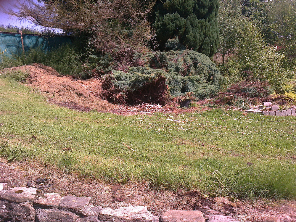 Skanky path as requested by @raisingirl Skanky other bit but with evidence of recent activity. Three month old rose/honeysuckle trimmings (composting) and this year's hanging basket display... Slightly overgrown pond. Red sled/watering trough for seed trays. š More recent activity. This is the view from my sunroom since Saturday. Digger boy removed a hideous Pampas grass leaving even more worser hideous hole with blue painted wall bits in, underside of giant juniper (?) prolly hiding dinosaurs and things, a grass heap that shouldn't be there but somebody lazy was mowing (more than once), juniper trimmings on........drum roll.....THE BANDSTAND! Oh and a dead larch size XXL. All this has nothing to do with me. I can't even drive a digger!Ā