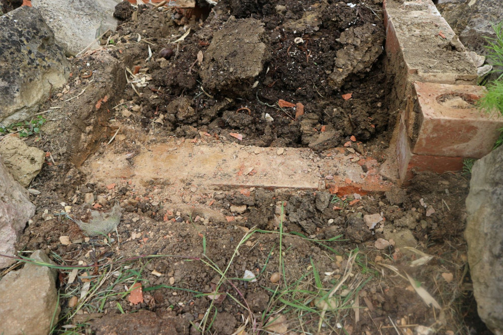 I have just taken down two part of a brick flower bed as nothing grew in it. On one side I want to attach a trellis and the other side I want to grass over. So far I have taken down two layers of brick on the left and on the front do I need to take more bricks out or will the grass grow OK. To the left will be grass and to the right is the rockery.