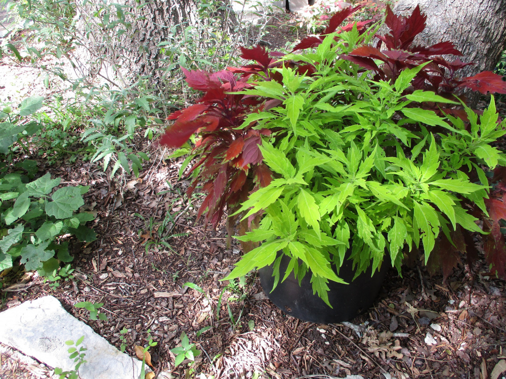 What about Coleus? I'm rooting a bunch in water today to expand those horizons. There are so many colorful varieties and different leaf shapes to choose from. Mine love their shade tree setting where only a bit of sunshine peeks through: