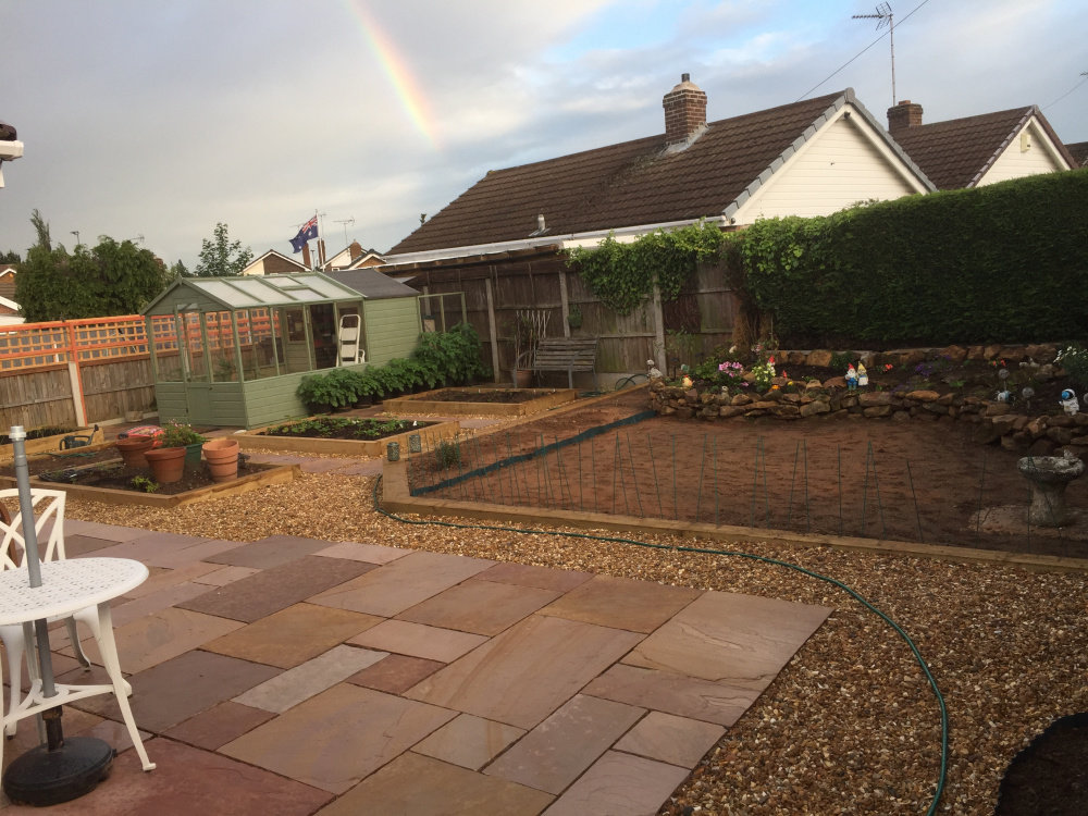 I’ve just had my garden landscaped it cost me £7000 but worth every penny, I still have a lot to do, I drew a plan and tweaked it with the landscapers as it was being done. That included the slabs and the greenhouse/shed