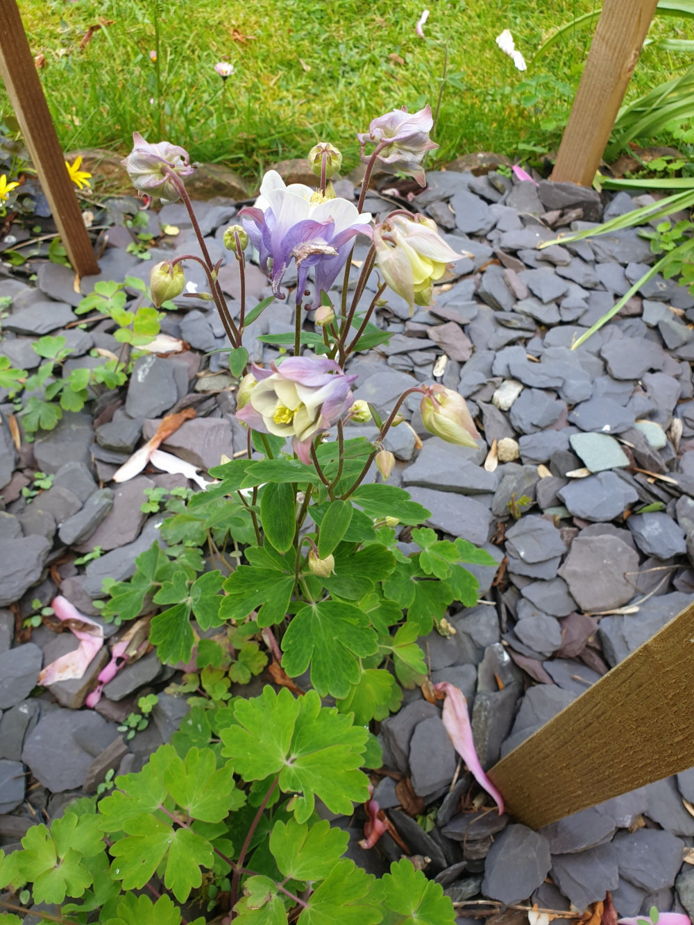 Here's a better picture, if a bit soggy looking it rained last night on my heavy clay soil, of what it could look like with things planted into the membrane ( the last picture was under my apple tree, was actually looking at the Aquilegia 🙂) Hope this gives you a few ideas.