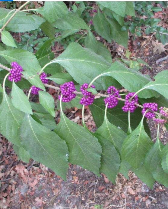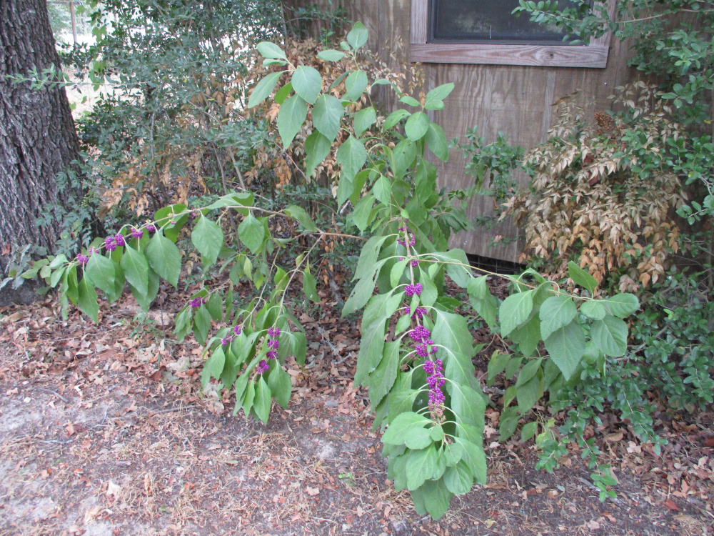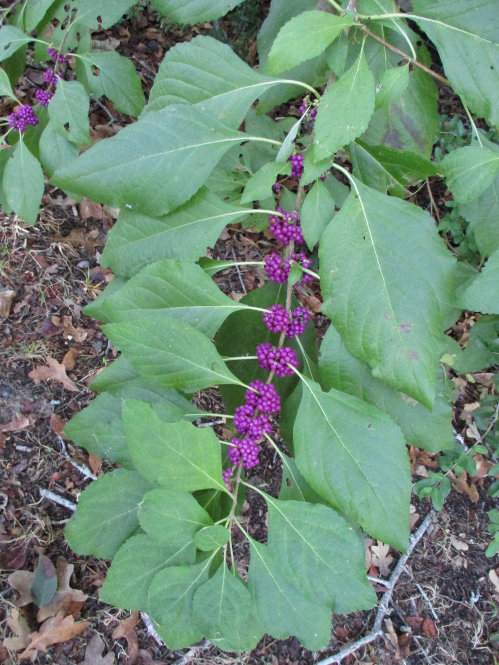 I've only just recently discovered Callicarpa Americana growing wild down at our rural cabin property. Found one by the laundry/storage building. Here are some photos I took of it high, hot summertime. Since I didn't know it was there, no watering or tending had been done when these shots were taken. I have since pruned it and discovered an even larger bush with many more trunks nearby in a dense thicket of Ilex (yaupon holly) along the fence. Pruned all 3 and have been watering them heavily, now that I have discovered them. So I'm expecting to see much healthier plants and more berries next Spring and Summer, especially on the largest one of them (not shown below). But they look pretty good for having just been planted by birds and tended by mother nature, don't you think?