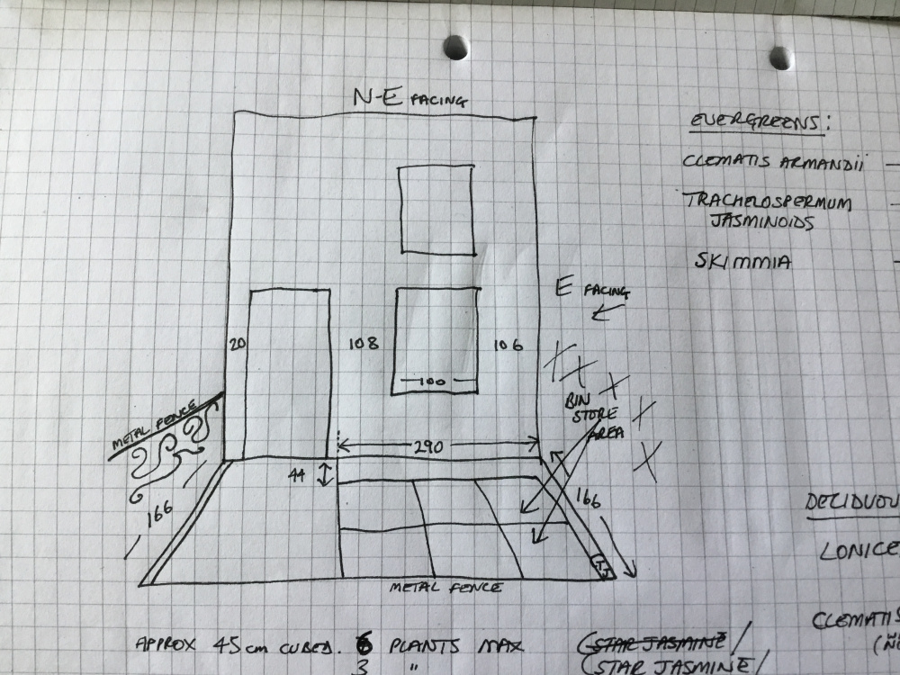 I can’t get the photo off my ancient phone, but here’s a rough diagram. We’re going to make a bin store (about 122 wide) and place it facing east on the far right, with a trellis above and beside. I’d like a strongly scented honeysuckle there, and also a Star Jasmine which I want to train along the front wrought iron fence. I’d also like another Star jasmine around the door and trained through the left side fence. We’re going to put trellis either side, and above, the window and door. We’ll put up wires above these when the plants outgrow them (I think depending on which areas look too empty...). So I figure I’ve got space for 6-7 plants at the back if I plant roughly 45cm apart. (The space behind the bin store is only 14cm wide, so I’m assuming that's not enough to plant the climbers?) After the 3 mentioned, that leaves me 3-4 plants to choose. I’ve been trying to make a list based on year round interest, but I’m like a kid in a sweetshop when I see clematis and roses...I want them all!