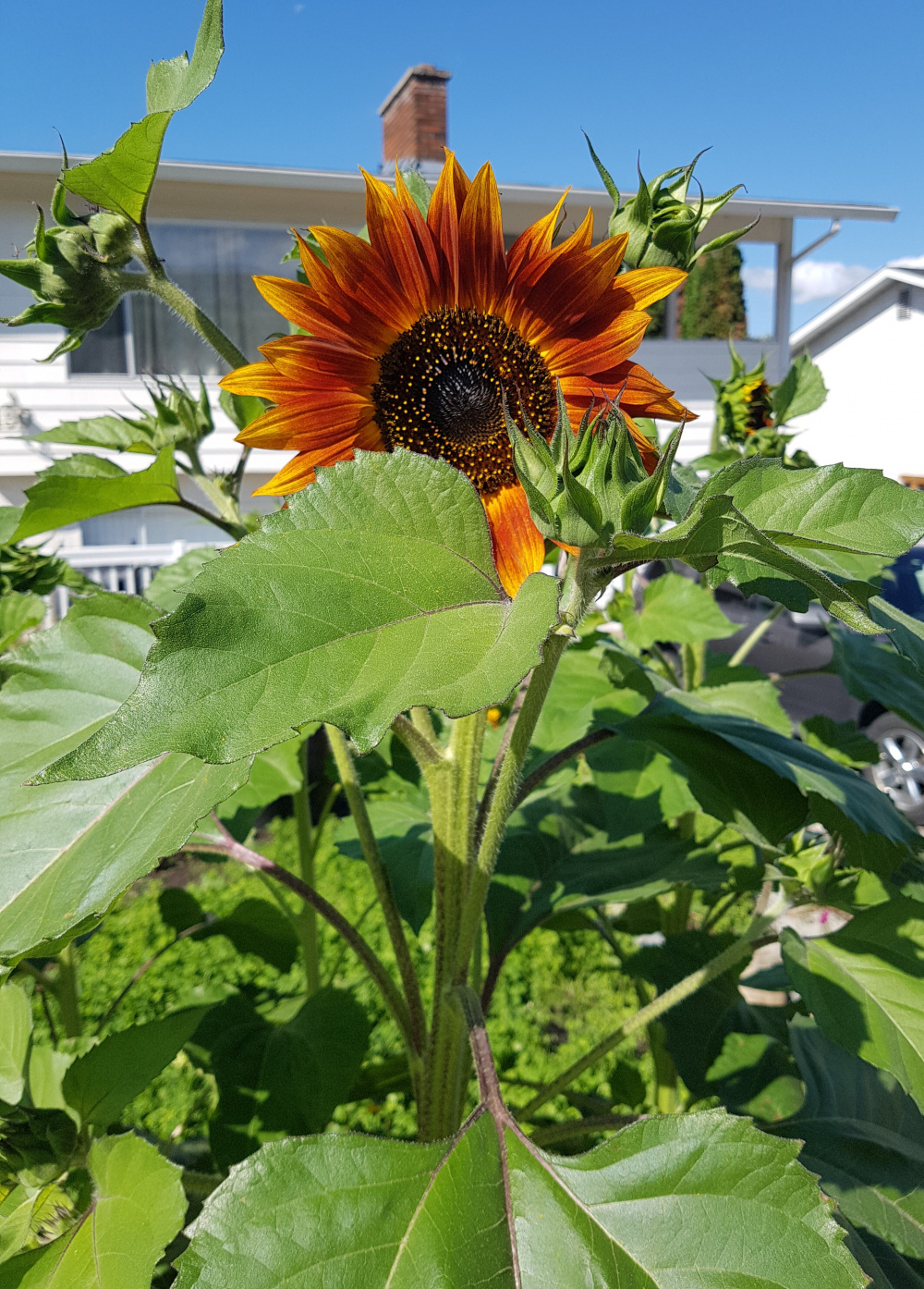 One of the sunflowers at the front row. This is going on the fifth year of collected seed from this variety.