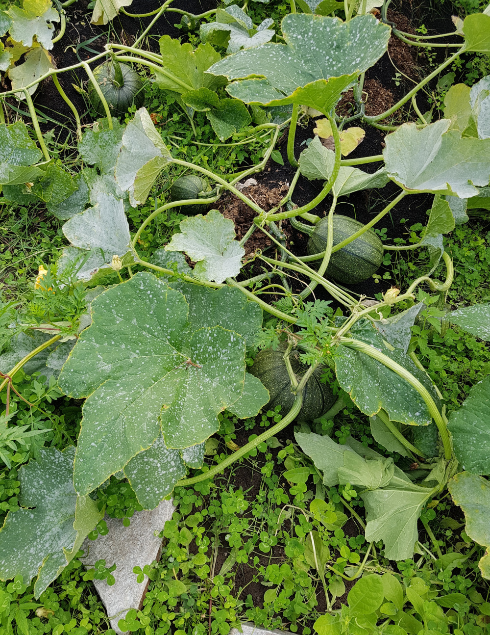Pulled out the front two plants infected with powdery mildew. They had no developing pumpkins yet. It's been a couple days, and now it appears to be spreading. I filled in some of the empty spaces with spare coneflower plants.